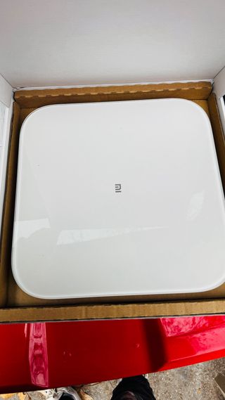 Báscula inteligente Xiaomi con diseño moderno y minimalista. Ideal para controlar tu peso y composición corporal. Tiene su uso pero funciona perfectamente. La tapa no cierra pero con un poco de celo se soluciona.