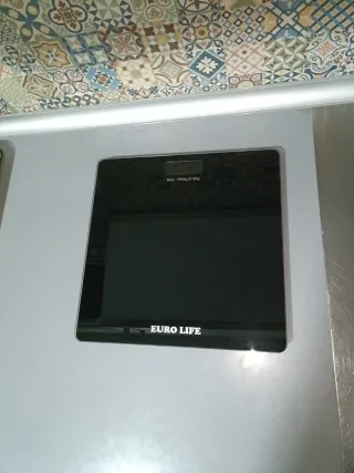 Báscula digital de diseño moderno y elegante. - Superficie de cristal negro. - Marca: Euro Life. - Indicador de peso máximo 180kg.