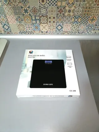 Báscula de baño digital marca Euro Life, modelo CD-28B. Diseño moderno y elegante. - Capacidad máxima de 180 kg. - Pantalla LCD para fácil lectura. - Precisión de 50 g. - Nuevo, a estrenar