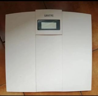 Báscula de baño Sanitas en buen estado. Es de color blanco y tiene una pantalla digital. - Funciona con pilas (no incluidas). - Diseño ligero y compacto. - Fácil de usar.