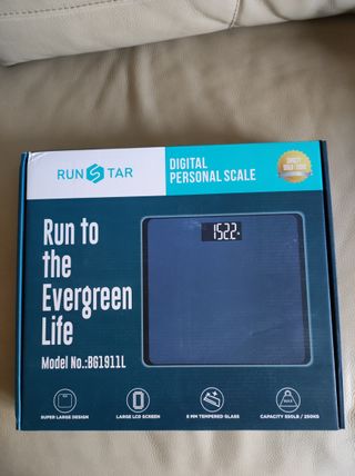Báscula digital personal Runstar. - Diseño de gran tamaño. - Pantalla LCD grande. - Cristal templado de 8 mm. - Capacidad máxima de 250 kg / 550 lb.