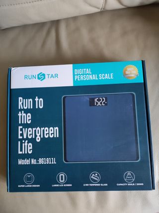 Báscula digital personal Runstar con plataforma de vidrio templado. - Capacidad máxima de 250 kg / 550 lb. - Graduación de 0.1 kg / 0.2 lb. - Pantalla LCD grande. - Indicador de batería baja y sobrecarga. - Encendido y apagado automático. - Requiere 3 pilas AAA.