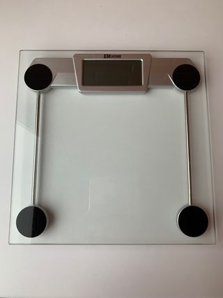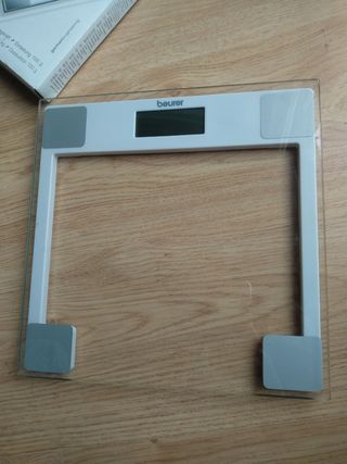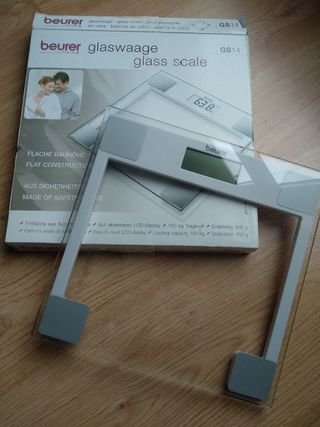 Modelo GS14 De cristal de seguridad Peso máximo: 150 kg El cristal está en perfecto estado y sin rayaduras Funciona con 1 pila de botón CR2032 de 3V (no incluida). Hay que quitar y poner la pila cada vez que te quieras pesar. Incluyo caja e instrucciones.