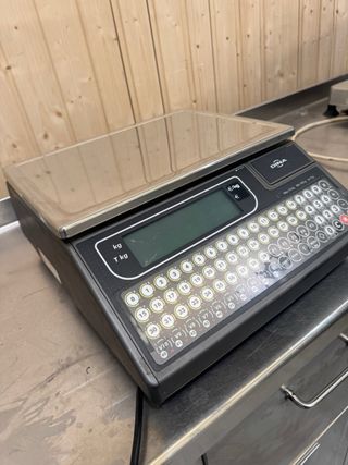 Báscula profesional frutería pescadería carnicería con teclado numérico y pantalla. Vale 1700€ Tiene dos impresoras una para tiquet y otra con pegatinas para los ingredientes etc . ⚠️.se ha roto el marco porudanza .se puede comprar aparte o usarla como piezas Precio no negociable ❌ - Teclado con números del 0 al 49. - Teclas de función como TICKET, LABEL, TOTALS, PROGRAM, CONFIG. - Pantalla LCD retroiluminada en azul. - Bandeja metálica. - Salida para impresora.