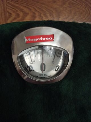 Báscula de máximo 130 kg, superficie de pelo sintético de color verde, casi como nueva, la pegatina de delante algo despegada y por debajo un poquito levantado el color