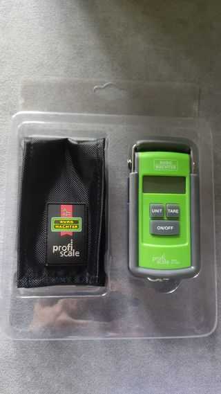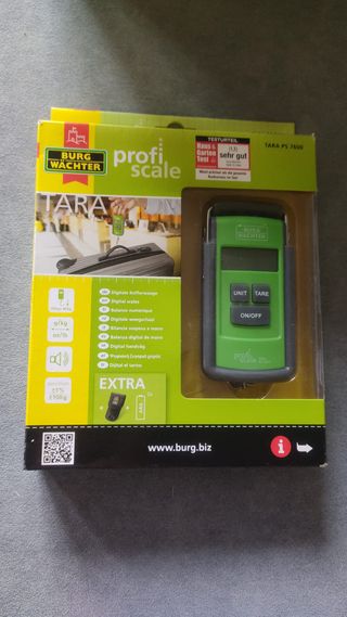 Báscula digital TARA de Burg Wächter, ideal para equipaje y paquetes. Es compacta y fácil de usar. - Capacidad máxima: 50 kg. - Precisión: ±1% o ±100 g. - Unidades de medida: g/kg, oz/lb. - Función TARA. - Incluye 2 pilas AAA.