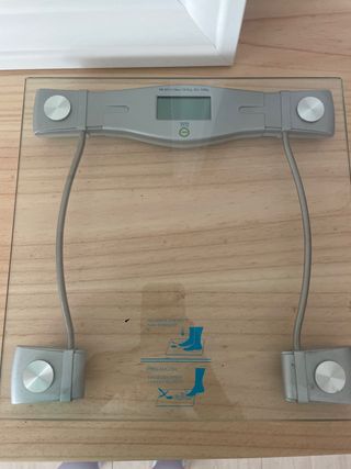 Báscula digital Jata con analizador fitness. Superficie de cristal templado y pantalla LCD. Está impoluta, súper bien cuidada y siempre en su caja. Me encanta pero mi pareja tiene otra y nos sobra una 😅 Detalles en las imágenes.