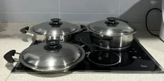 Batería de ollas AMC en excelente estado y sin usar. Fabricadas con acero inoxidable de alta calidad, ideales para cocinar de forma saludable, sin apenas aceite y conservando al máximo el sabor y los nutrientes de los alimentos. Incluye tapas originales y fondo difusor para una distribución uniforme del calor. Compatibles con todo tipo de cocinas (incluida inducción). Perfectas para quienes buscan durabilidad, eficiencia energética y una cocina más fácil y rápida. Lista para entregar y en perfecto funcionamiento.