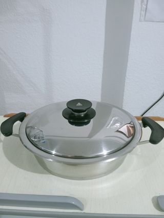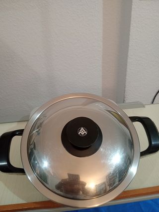 Preciosa olla de acero inoxidable A M C no hago envíos BIEN LIMPIA Y PULIDA POR PROFESIONAL medidas diámetro 28 cm., alta 12cm. PARA TODOS LOS FUEGOS TAMBIÉN PARA VITROCERÁMICA ( PERO NO PARA INDUCCIÓN)EN MI PERFIL VERAS MUCHAS OLLAS AMC DE TODAS LAS MEDIDAS Y LITROS DE CAPACIDAD. REF. 7852