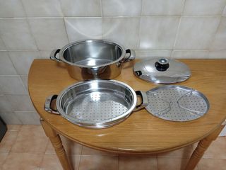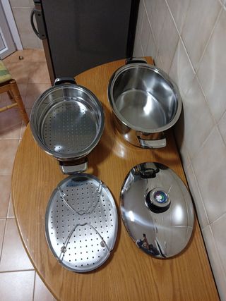 Set de olla y vaporera AMC de 24 cm completamente nuevo. - Fabricado en acero inoxidable 18/ 10, el mejor - Asas y pomo de baquelita suaves y fríos. ,- Valida para todos los fuegos menos la inducción. Tengo muchas cosas de AMC y si no las tengo ahora pregúntame. Visita mi perfil y crea tu propio lote con la opción de wallapop. Es súper fácil y ahorras en gastos de envío