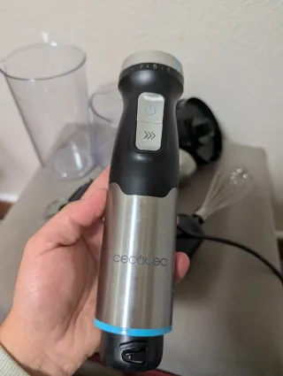Batidora de mano Cecotec con varios accesorios. - Mango ergonómico. - Varillas para montar. - Cuchillas para picar. - Vaso medidor. - Vaso picador.
