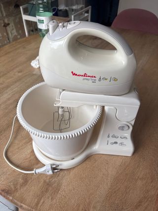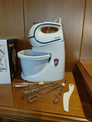 Batidora amasadora de la marca Taurus, ideal para preparar todo tipo de masas y mezclas en la cocina. Incluye varios accesorios. - Diseño blanco y gris. - Base con bol. - Accesorios de varillas y amasadores. Sólo se le ha dado un uso...como nueva.