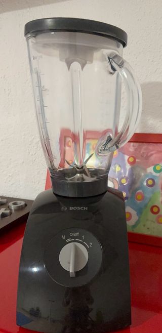 Batidora de vaso de la marca Bosch. Su diseño es moderno y funcional. - Jarra de cristal. - Base de plástico negro. - Selector de velocidad con posición M (pulsador), O/off, 1 y 2.