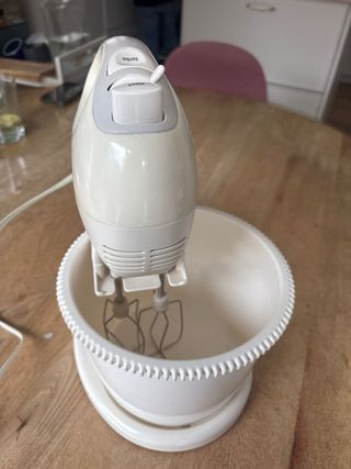 Batidora de mano de la marca Jata. Ideal para piezas o para quien sepa repararla. - Diseño en blanco y gris. - Incluye cable de alimentación.