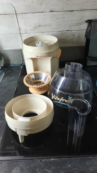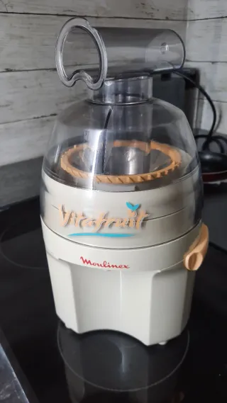 Conjunto de Licuadora Moulinex Vita-fruit y batidora USB de seis cuchillas para smoothies. Ideal para preparar batidos de frutas y verduras. - Uso y limpieza sencillos. - Licuadora compacta con recoje cable en la zona inferior. Tiene un pequeño defecto en la pieza de empuje que no afecta al funcionamiento. Ver fotos. - Batidora de carga USB. Tiene seis cuchillas para corte más fino. Libre de cables. Cargar y usar.