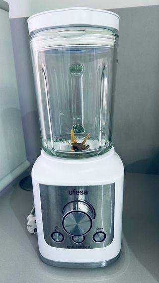 Batidora de vaso Ufesa con acabado Opal Titanium. Ufesa Batidora de Vaso, 1800W, Jarra de Cristal de 1.8L, Control Electrónico LED de Velocidad, 3 Funciones, Turbo, Hielo, Smoothies, 6 Cuchillas de Titanio, Libre de BPA, Inox Blanco - Potencia de 1800W. - Jarra de cristal. - Múltiples velocidades y función turbo. - Diseño moderno y funcional. . Solo se ha usado esporádicamente para hacer gazpacho, nunca ha picado hielo ni nada solido con lo cual las cuchillas están intactas. Está impecable y soy muy cuidadosa. Vendo por comprar la thermomix