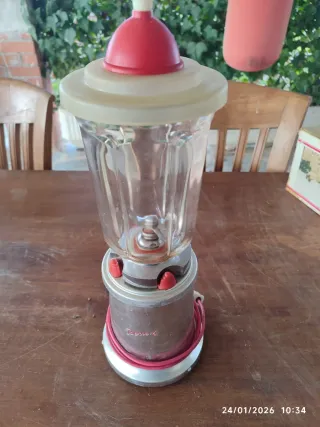 Batidora antigua funciona a 125w. Su diseño vintage la hace un objeto decorativo. - Cuerpo metálico. - Vaso de cristal. - Tapa de plástico con embudo.