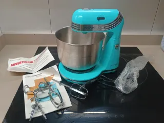 Batidora de pie Cecotec Cecomixer Easy en color azul. - Bol de acero inoxidable. - Diseño retro. - Incluye varillas y amasadores.