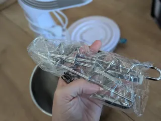 Batidora de mano SilverCrest en color blanco, ideal para repostería y cocina. - Incluye varillas para batir y amasadores. - Brazo batidor para cremas y purés. - Bol giratorio. - Diseño moderno y funcional. Solo tiene dos usos lo vendo porque me han regalado una batidora industrial.