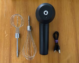 Batidor eléctrico de mano marca Elta, en muy buen estado. Incluye dos accesorios de varillas intercambiables (uno más pequeño y otro grande) ideales para batir huevos, montar nata, mezclar masas ligeras o preparar salsas. Funciona con cable USB para cargar, incluido. Es ligero, cómodo de usar y fácil de limpiar. Perfecto para uso diario en la cocina.