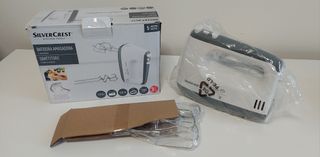 Batidora de cocina Silvercrest multifunción de 300W, en perfecto estado. Incluye todos los accesorios que se ven en las fotos: - Recipiente mezclador. - Varillas para batir. - Ganchos para amasar. - Vaso medidor. - Manual de instrucciones.