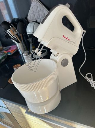 Batidora amasadora Moulinex con bol giratorio y accesorios completos. En perfecto estado aunque un poco usado. Como nuevo, funcionamiento impecable. 🔵Bol de plástico resistente de gran capacidad, colocado sobre base giratoria para un mezclado uniforme. 🔵Varillas batidoras metálicas para mezclar cremas. 🔵Ganchos amasadores metálicos para masas densas. 🔵Soporte fijo que mantiene el bol en su sitio durante el uso. 🔵Botón de expulsión de varillas y ganchos funcionando correctamente. 🔵Fácil de desmontar para limpieza. 💡 Ideal para quienes buscan un electrodoméstico práctico. MIRA MIS VALORACIONES PARA MÁS CONFIANZA🌟🌟🌟🌟🌟🌟
