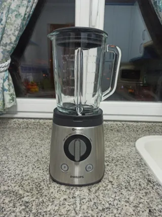 Batidora de vaso Philips con jarra de cristal. - Modelo ProBlend 6. - Jarra de cristal con medidas. - Base de acero inoxidable. - Selector de velocidad y función P (Pulse). - Botones Fast Clean y Quiet. - Tiene una pequeńa lasca en el borde del vaso de cristal