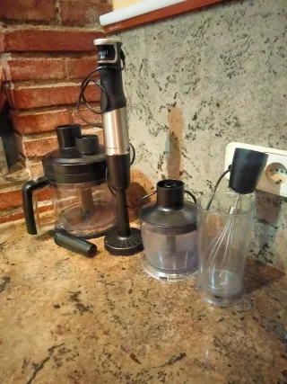 Batidora con accesorio de vaso pequeño y grande, 3 cuchillas y batidor. Esta usado aunque funciona perfrctamente, el precio es bajo porque el articulo no es nuevo.