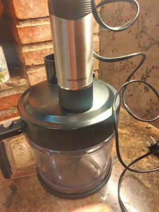 Batidora de mano Silvercrest con varios accesorios. Precio NO negociable. - Incluye batidora de mano, vaso medidor, picador y varillas. - Diseño en color negro y plateado. El recipiente grande tiene una raya tipo grieta, pero no se sale está en perfecto estado hay foto, la última. Entrego en mano.