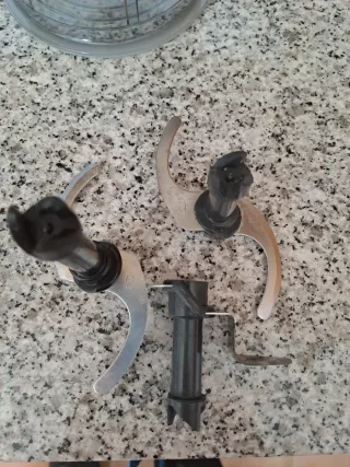 Conjunto de repuestos picadora de la batidora Bosch. Corresponde a una batidora Bosch MaxoMixx de 750 W. Repuesto 12029658 que también sirve para otros modelos de batidora (consultar antes de comprar) - Cuchillas de acero inoxidable. Incluye cuchillas pequeña, grande y cuchillas de hielo. - Accesorios de plástico negro. Incluyen tapa y dos contenedores de talla pequeña y grande. El grande nunca usado. Tapa de cierre. REGALO la batidora que funciona perfectamente pero tiene pelado el cable por si algún manitas lo puede arreglar (últimas fotos).