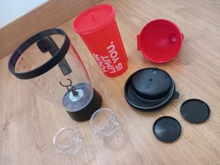 Biochef con varios accesorios, perfecta para hacer zumos, batidos ... - Base del motor. - Vaso grande. - Vaso pequeño con tapa. - Tapa con asa. - Dos tapas planas. - Cuchilla. 12 piezas