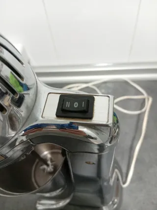 Batidora de acero inoxidable de estilo retro en total funcionamiento. Dos velocidades y gran potencia.