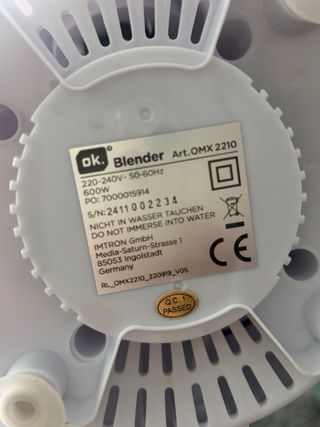 Batidora de vaso OK modelo OMX-2210 con una potencia de 600W y capacidad de 1.5 litros. Su diseño es blanco y transparente. - Está perfecta, muy poco uso. - Jarra de plástico transparente. - Base de motor en color blanco. - Selector de velocidad con 3 posiciones y función Pulse.
