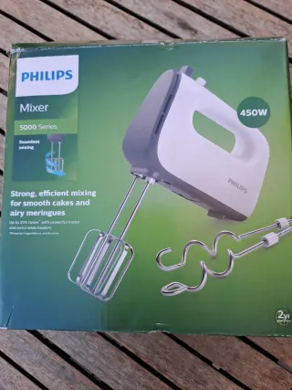 Batidora de mano Philips 5000 Series con motor de 450W. Diseñada para mezclar de forma eficiente y obtener resultados suaves. - Incluye varillas batidoras. - Color blanco y gris.