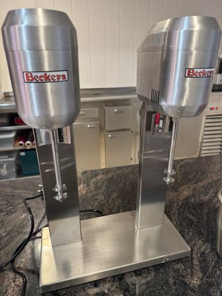 Batidora profesional doble de la marca Beckers, ideal para heladerías o negocios de hostelería. Como nueva con instrucciones y en su caja original. - Medidas 330x160x490mm - Construcción robusta en acero inoxidable. - Dos vasos para preparar batidos simultáneamente. - Diseño compacto y funcional.
