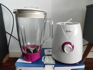 Batidora de vaso de la marca Jata. Cuenta con un diseño moderno y funcional. - Jarra de cristal. - Base blanca con detalles en color morado. - Selector de velocidad con posición 0 y P.