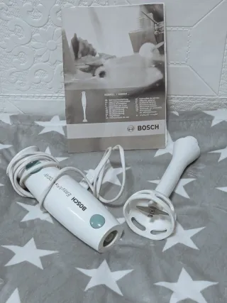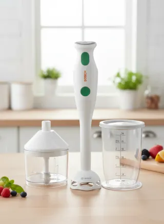 - Batidora de mano Bosch Easy Mixx con pie de plástico. - Potencia de 300W. Pie de plástico, Eyectable, Accesorio picador universal con cuchilla de acero inoxidable, Sirve como recipiente con tapa para conservar los alimentos picados, Varilla mezcladora con cuchilla diseñada con 2 trinchadores verticales adicionales, corta, tritura y pica el hielo, Vaso mezclador graduado con tapa, Anilla para colgar, - Diseño estilizado y ergonómico, Muy ligera, solo 570 gr., Muy silenciosa. - Modelo: Easy Mixx - Potencia: 300W - Color: Blanco