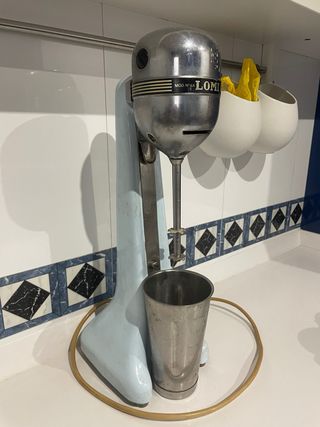 Batidora de vaso para helados y batidos. Ideal para hostelería. - Cuerpo metálico plateado con detalles azules. - Vaso de acero inoxidable. - Brazo mezclador de acero inoxidable.