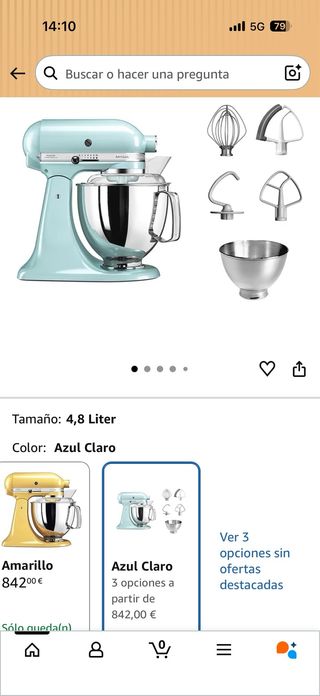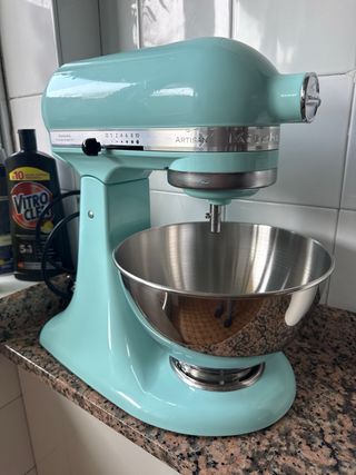 Chollo!!!! Como nueva!! Aun con garantia!! Solo usada para hacer algun bizcocho al mes los demas utensilios estan sin usar. Batidora KitchenAid en color Azul Claro, con una capacidad de 4,8 litros. Incluye varios accesorios. - Color: Azul Claro - Capacidad: 4,8 Litros - Accesorios incluidos: varillas, gancho amasador, pala mezcladora y bol de acero inoxidable.