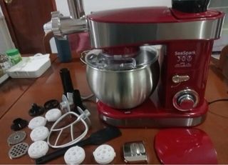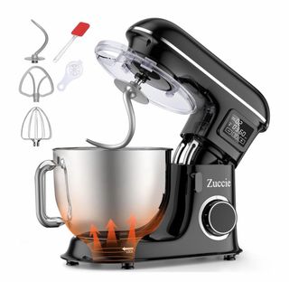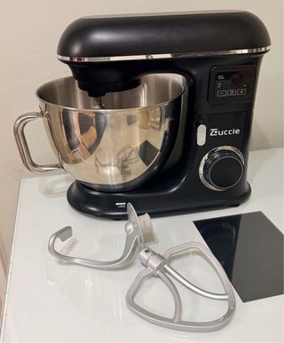 Batidora amasadora de la marca Zuccie, con una capacidad de 8 litros y una potencia de 1500W. Incluye varios accesorios para diferentes preparaciones. - Diseño moderno en color negro. - Bol de acero inoxidable. - Tapa protectora transparente. - Accesorios: gancho amasador, varillas batidoras y paleta mezcladora. - Incluye espátula de silicona y separador de huevos.