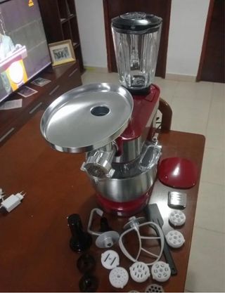 Te facilita las tareas a la hora de cocinar ya que : Pica, bate, mezcla, amasa, permite elaborar: distintos tipos de pasta fresca, churros y además de llenar embutidos (chorizos, salchichas). Tiene una potencia de 1000watios ,5 velocidades más una turbo. El bol de amasado es de acero inoxidable y de buena capacidad. La jarra de la batidora es de metacrilato con una capacidad de 1,5 L. Al poseer ventosas en la base y varios sistemas de seguridad, la hacen muy segura a la hora de cocinar. Solo tiene algunas marcas de uso.