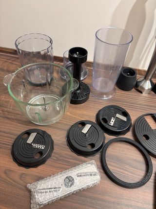 Conjunto de accesorios para batidora de mano Braun. - Varillas para montar nata o claras. - Cuchilla para picar y triturar. - Vaso medidor. - Pie de batidora de acero inoxidable. - Pie de batidora negro.
