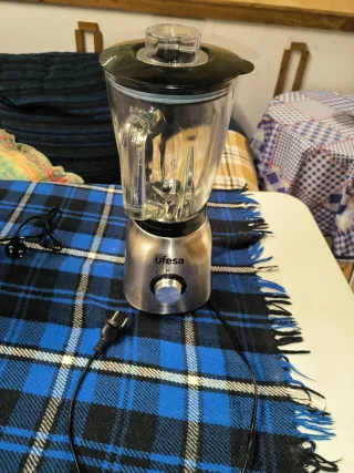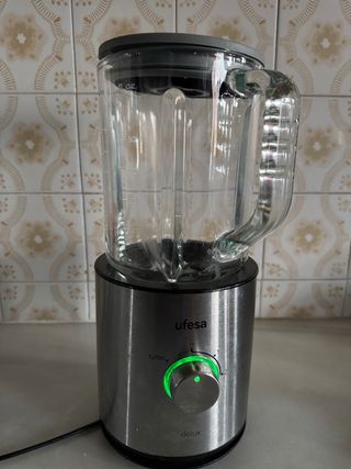 Batidora de vaso con jarra de cristal de la marca Ufesa. Su diseño combina una base de acero inoxidable con detalles en negro. - Jarra de cristal. - Base de acero inoxidable y plástico negro. - Marca: Ufesa. Funciona perfectamente ideal para purés y batidos, dos velocidades. La vendo por falta de espacio. El precio no es negociable, ya está muy ajustado el precio.