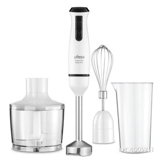 Batidora de mano Ufesa con motor de 1000W. - Incluye vaso medidor graduado. - Accesorio batidor emulsionador. - Accesorio picador.