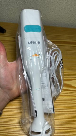 Batidora de mano Ufesa con una potencia de 400W. Su diseño es blanco con detalles en azul. Perfecto estado. - Mango ergonómico. - Varilla de acero inoxidable. - Botones de control. - Enchufe europeo.
