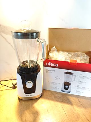 Batidora de mesa Ufesa White Gold. Tiene una tapa rota no afecta al funcionamiento ver ultimas fotos - Jarra de cristal de 1.5L. - Regulador de velocidad con luz LED. - Cuchillas de acero inoxidable. - Diseño moderno en blanco y negro.