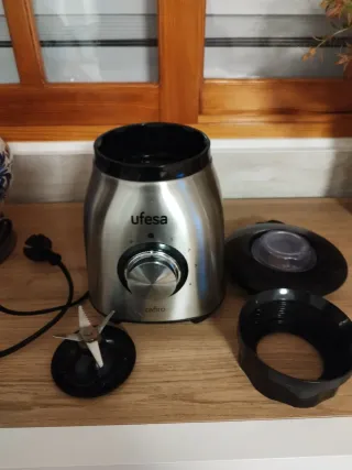 Batidora de vaso Ufesa Deluxe con acabado en acero inoxidable. Vaso de 1,75L y 1200w. Tiene tres programas, turbo, hielo y smoothi. Dispone de 6 cuchillas. Lo he utilizado una vez o dos si llega. - Jarra de cristal. - Diseño moderno y elegante.