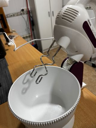 Batidora amasadora nueva, sin uso. Comprada en MediaMarkt por 42€ como se puede apreciar en la última foto del anuncio. ✔️ 500W ✔️ 5 velocidades + turbo ✔️ Varillas amasadoras y batidoras ✔️ Caja para accesorios ✔️ Botón de expulsión Funciona perfectamente. Entrega en mano.