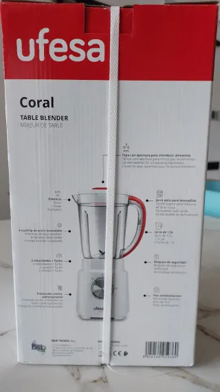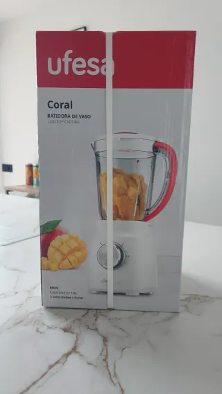 Batidora de vaso Ufesa Coral en color blanco. Ideal para preparar batidos y smoothies. Sin estrenar. - Potencia de 600W. - Capacidad de 1.5 litros. - Dos velocidades y función Pulse. - Jarra de cristal.