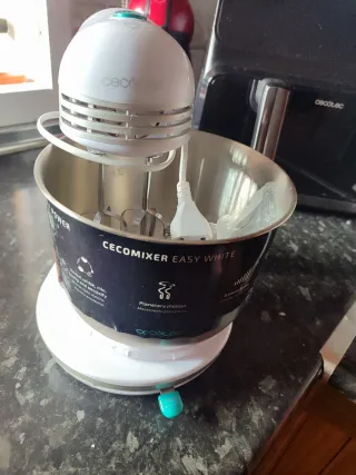 Batidora amasadora Cecotec en color blanco y gris con detalles en verde. - Bol de acero inoxidable 3 litros. - Diseño moderno y compacto. - Incluye varillas y ganchos.
